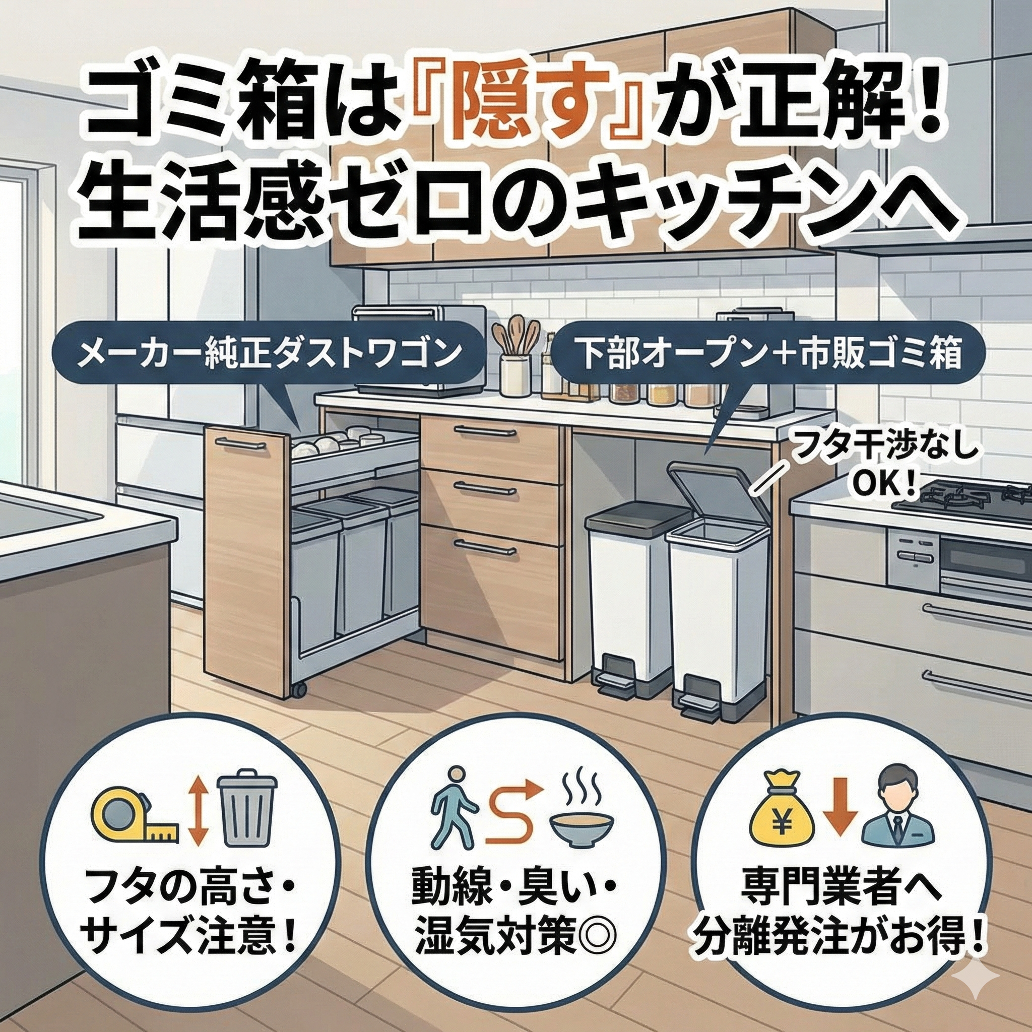 新築キッチンの計画で、意外と頭を悩ませるのが「ゴミ箱の置き場所」です。「せっかくの新築だから生活感を出したくない」「通路にゴミ箱を置くと邪魔になる」といったお悩みをお持ちではないでしょうか。 結論から申し上げますと、キッ […]