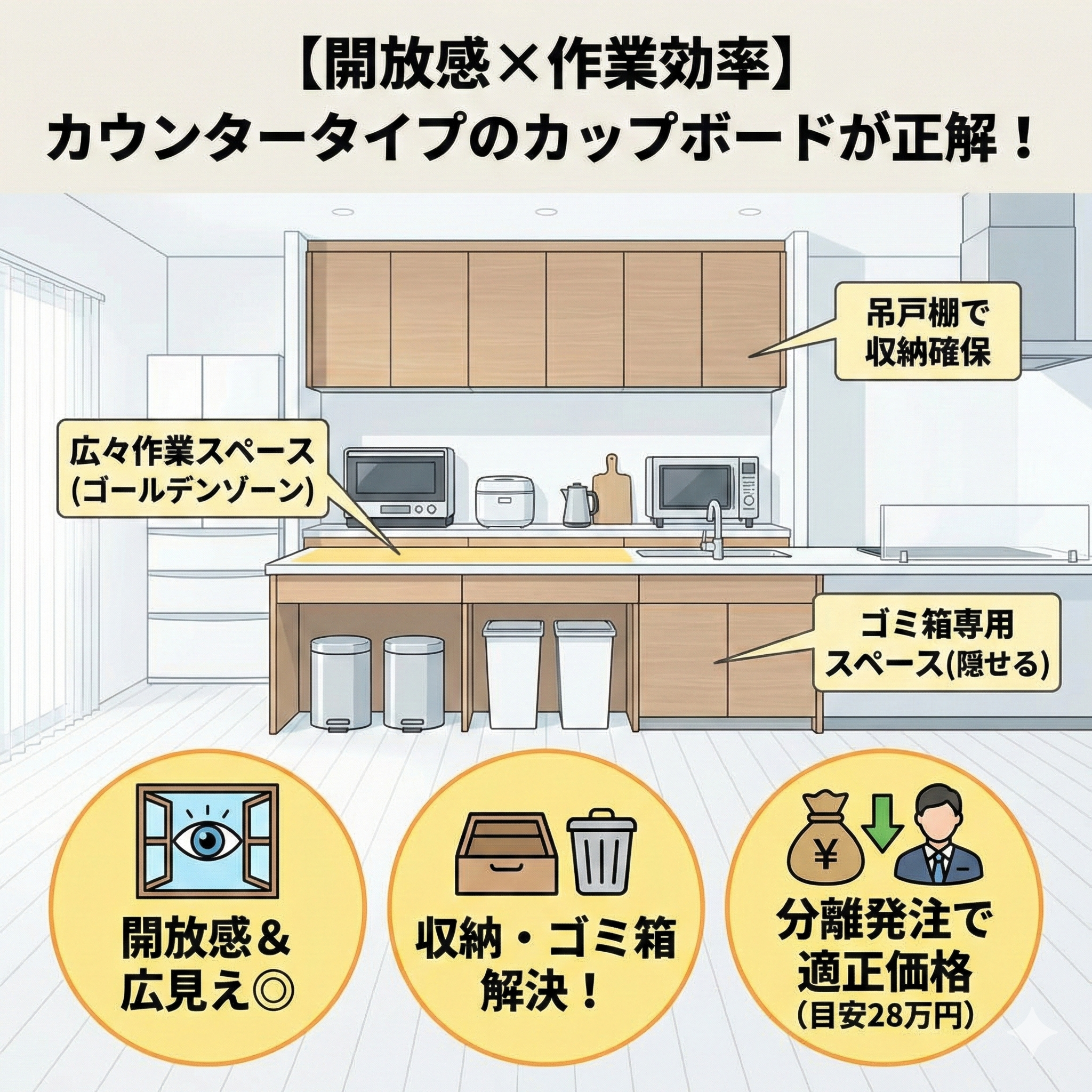 カップボード【開放感×作業効率】カウンタータイプのカップボードで叶える理想のキッチン|収納力やゴミ箱問題も解決