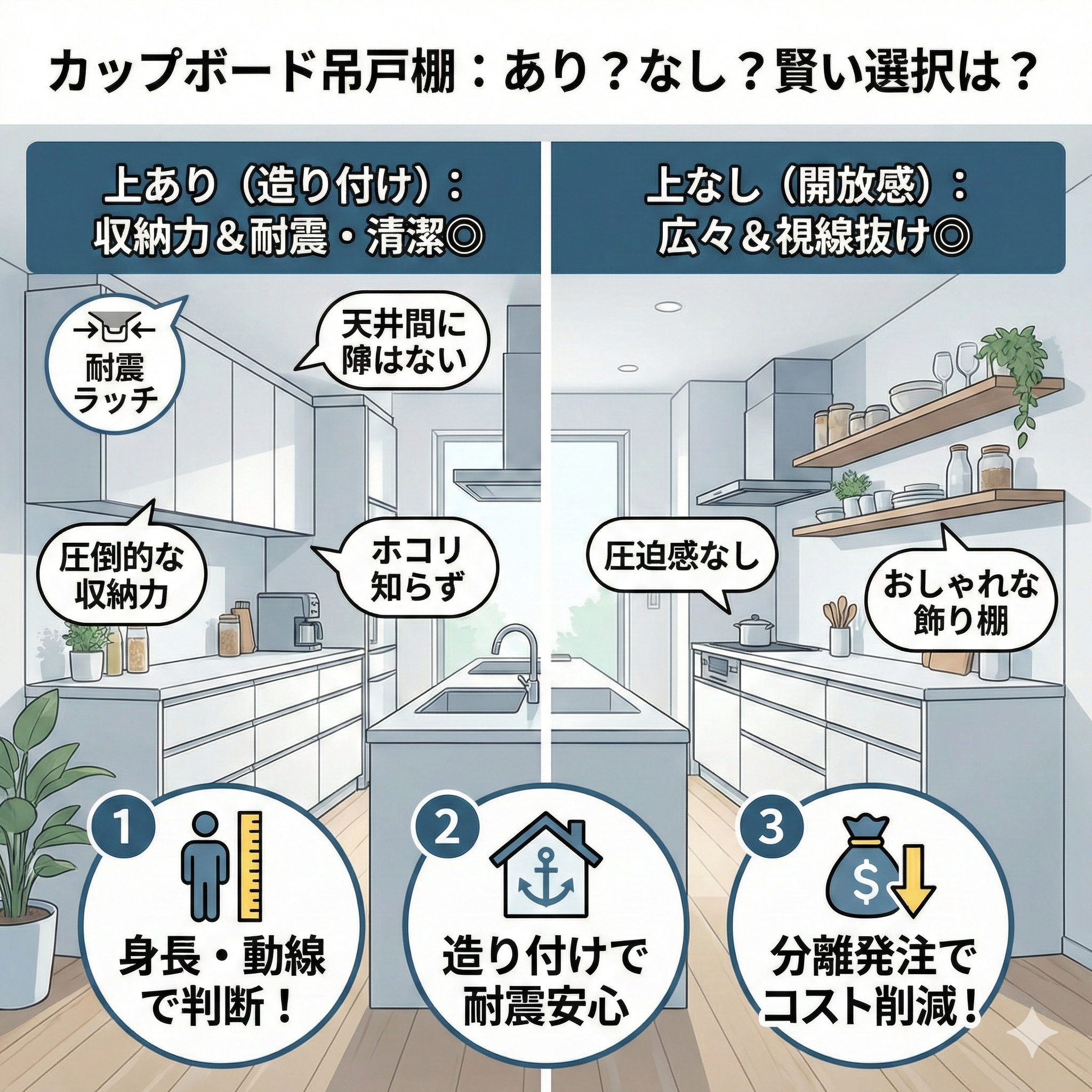 新築のキッチン計画で多くの人が頭を悩ませるのが、カップボード(食器棚)の「上部分」、つまり吊戸棚や上置き収納を設置するかどうかという問題です。「収納力は絶対に確保したいけれど、天井まで棚があるとキッチンが狭く見えそう…… […]