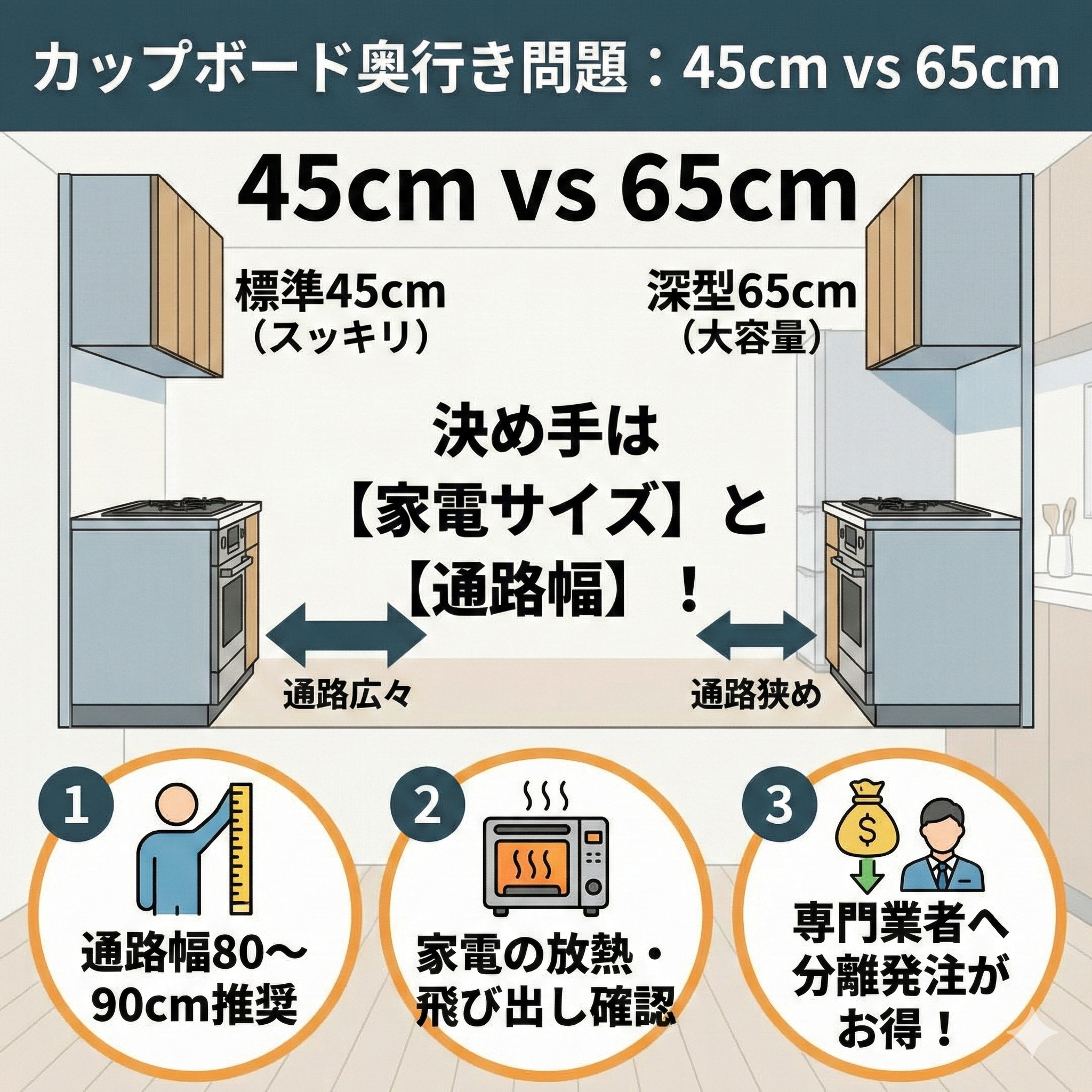 カップボードカップボードの奥行きは45cm?65cm?大型家電と通路幅の正解バランス