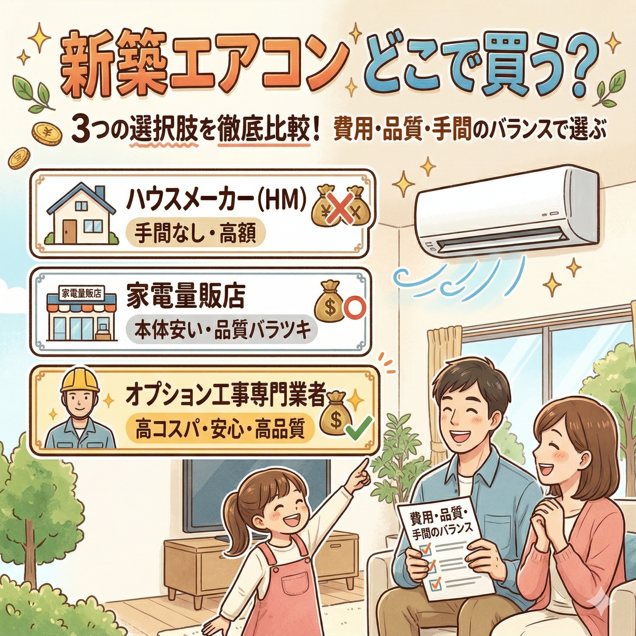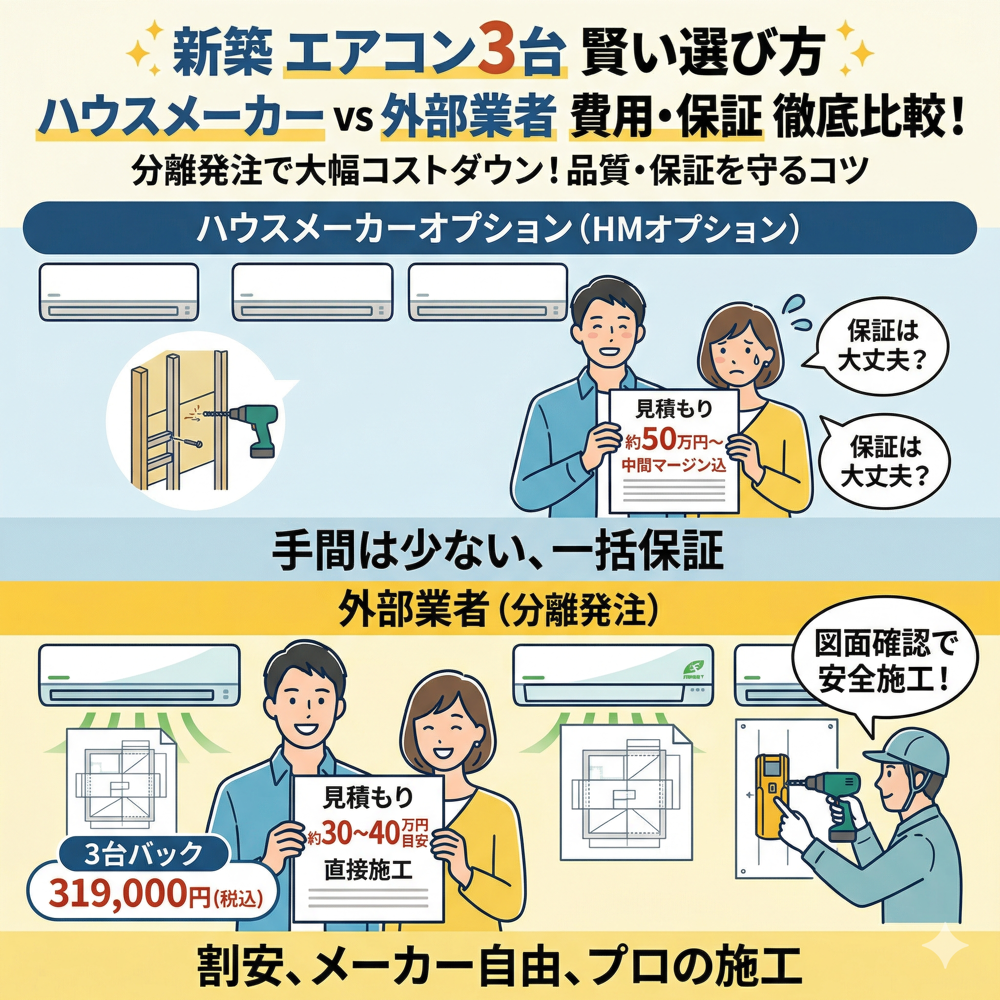 エアコン新築でエアコン3台の費用相場は?ハウスメーカーと外部業者の比較・保証リスク対策