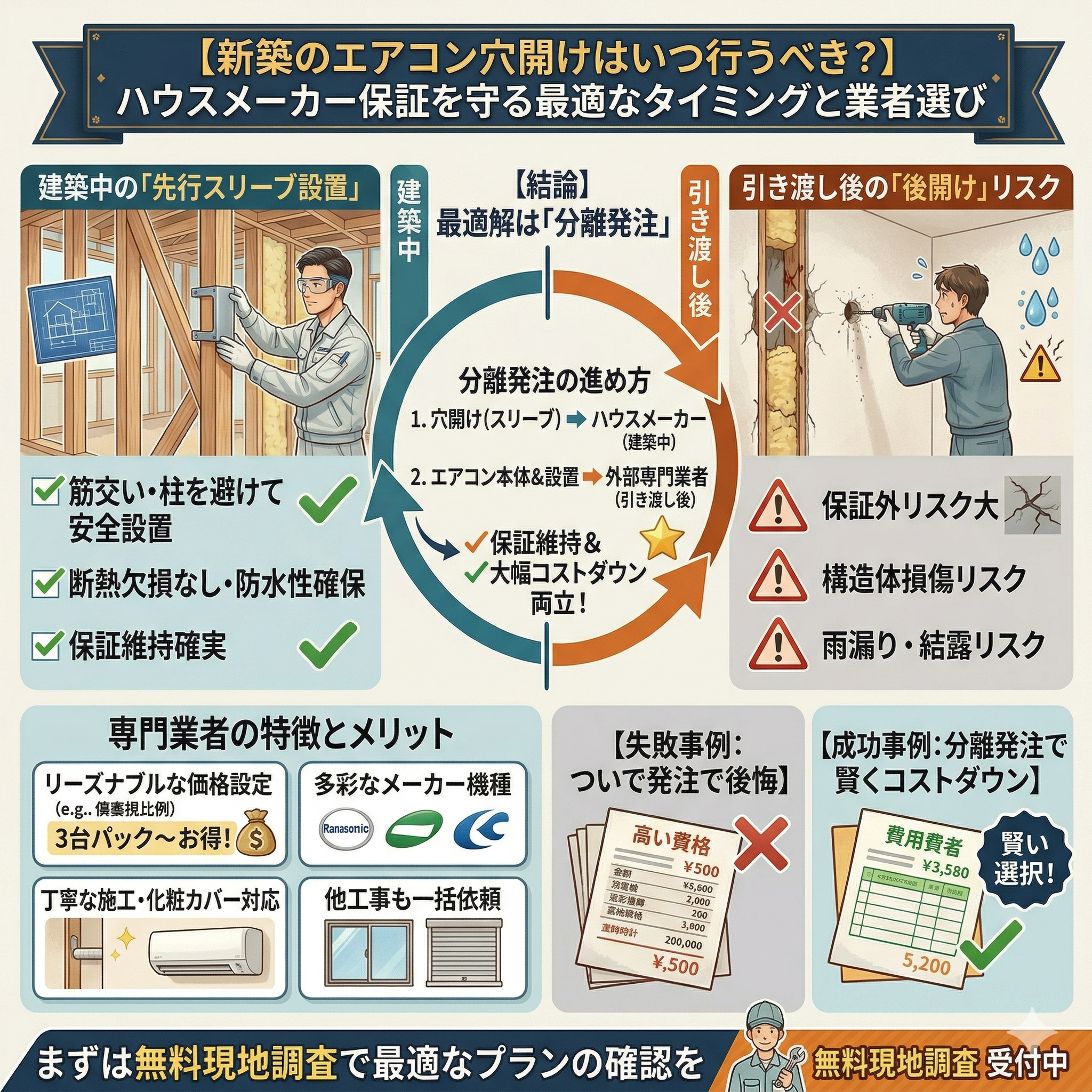 エアコン新築のエアコン穴開けはいつ行うべき?ハウスメーカー保証を守る最適なタイミングと業者選び