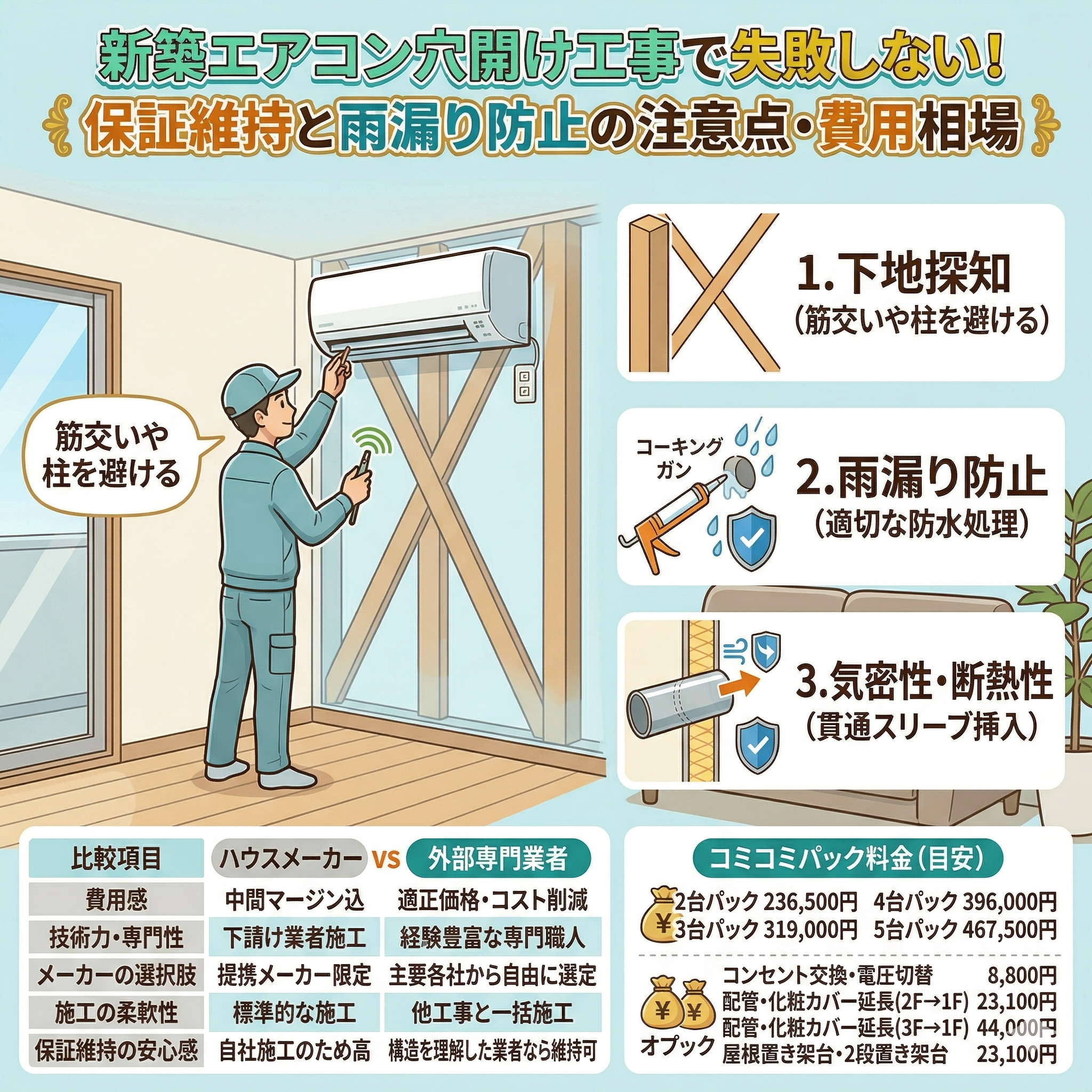 エアコン新築のエアコン穴開け工事で失敗しない!保証維持と雨漏り防止の注意点・費用相場