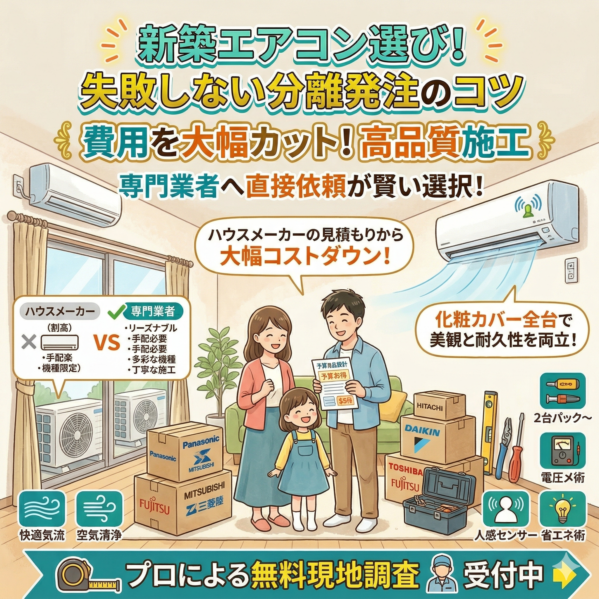 【結論】新築エアコンの設置は専門業者への「分離発注」が賢い選択 新築戸建てのエアコン設置は、ハウスメーカーに依頼するよりもオプション工事専門業者へ分離発注することで、高品質な施工を維持しながら費用を大幅に抑えることが可能 […]