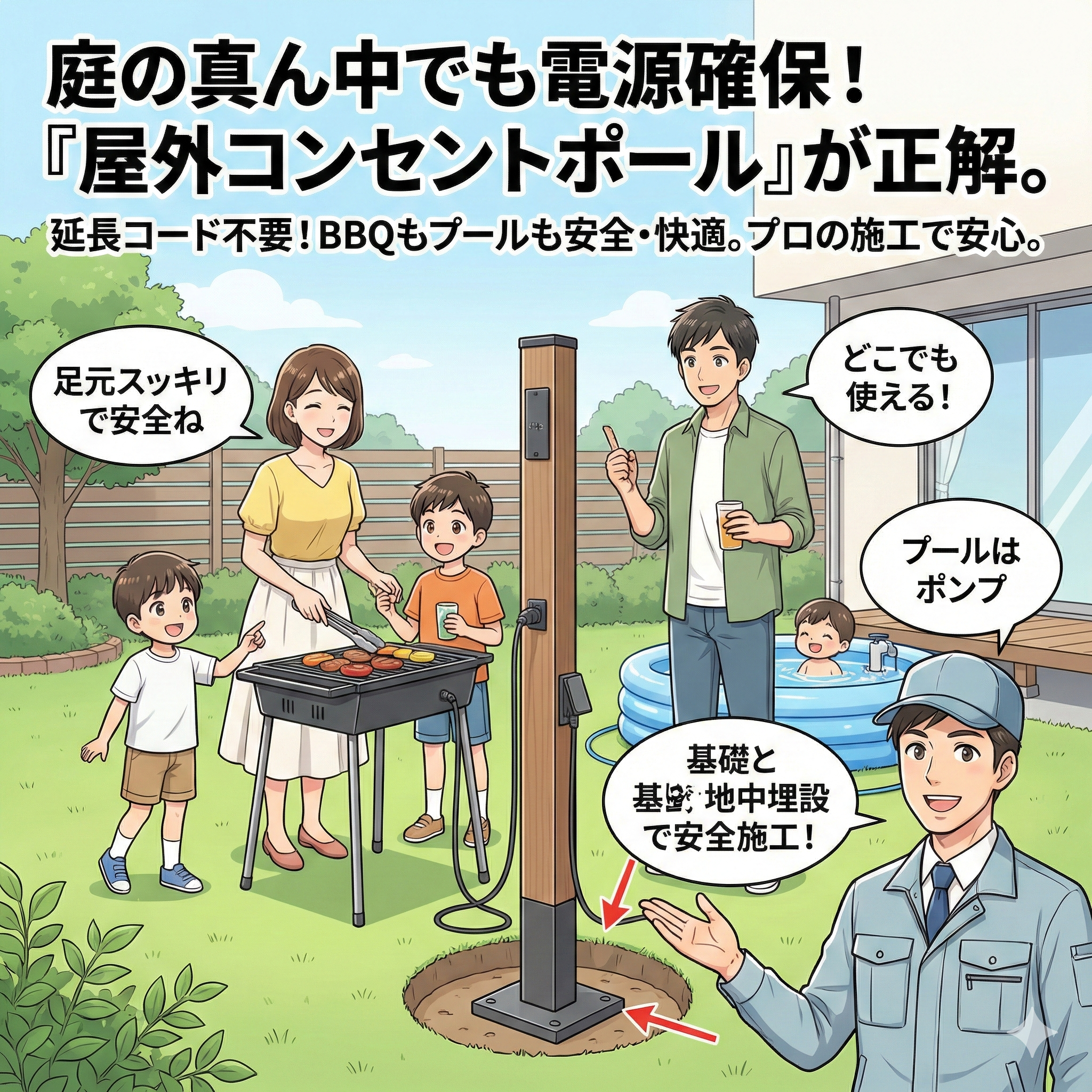 屋外コンセント増設工事庭の真ん中で電源確保!屋外コンセントポールの種類と失敗しない設置術