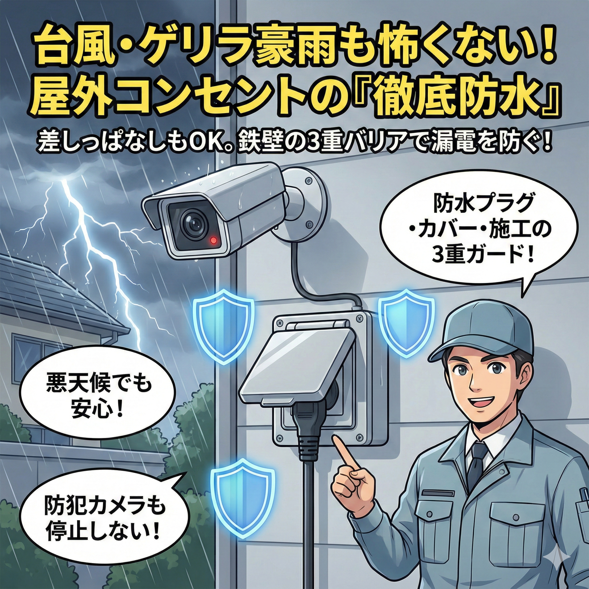 屋外コンセント増設工事台風・ゲリラ豪雨も怖くない!屋外コンセントの「徹底防水」3重バリアと安全対策