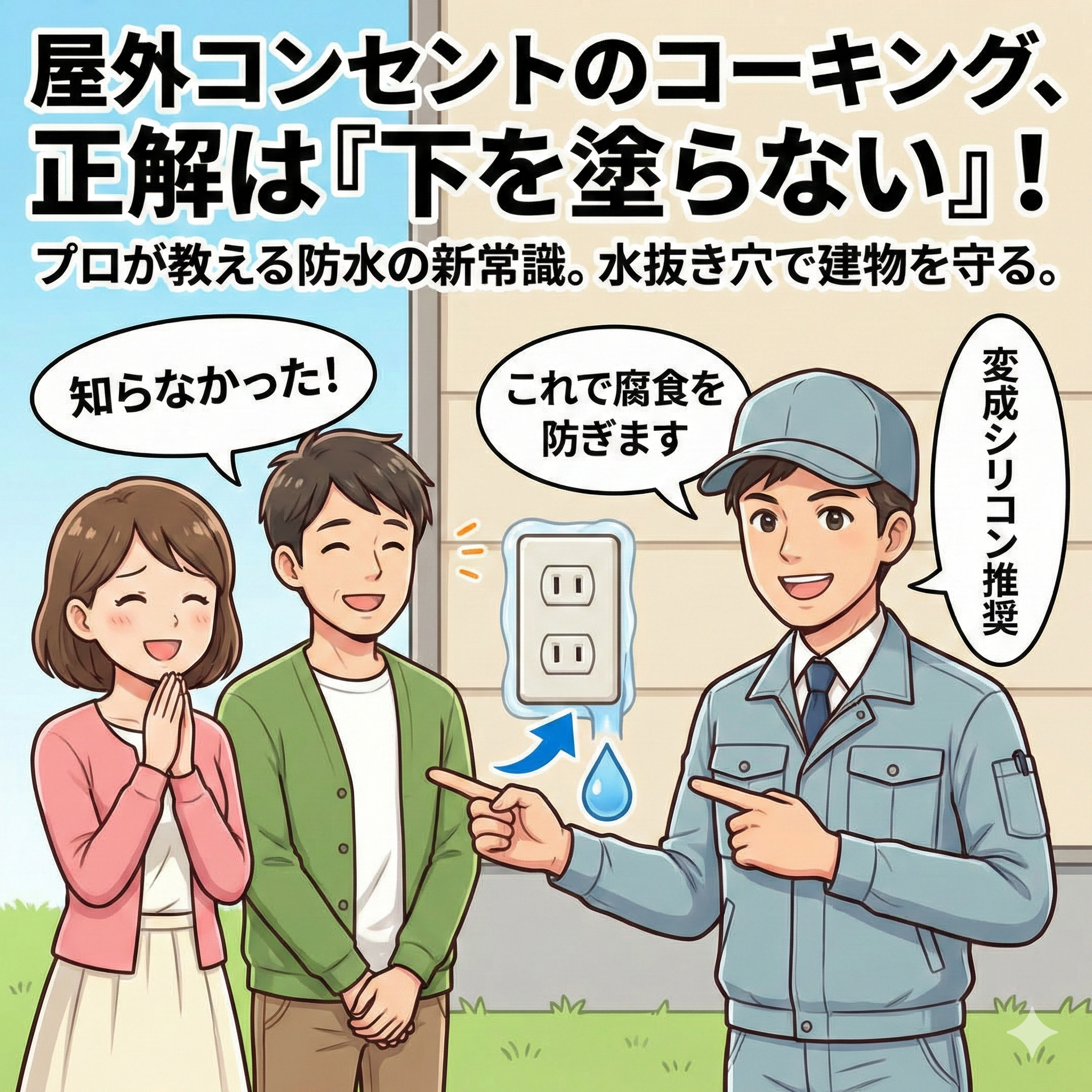 屋外コンセント増設工事10年経っても浸水させない!屋外コンセントの「正しいコーキング」完全ガイド【下を塗らない理由とは?】