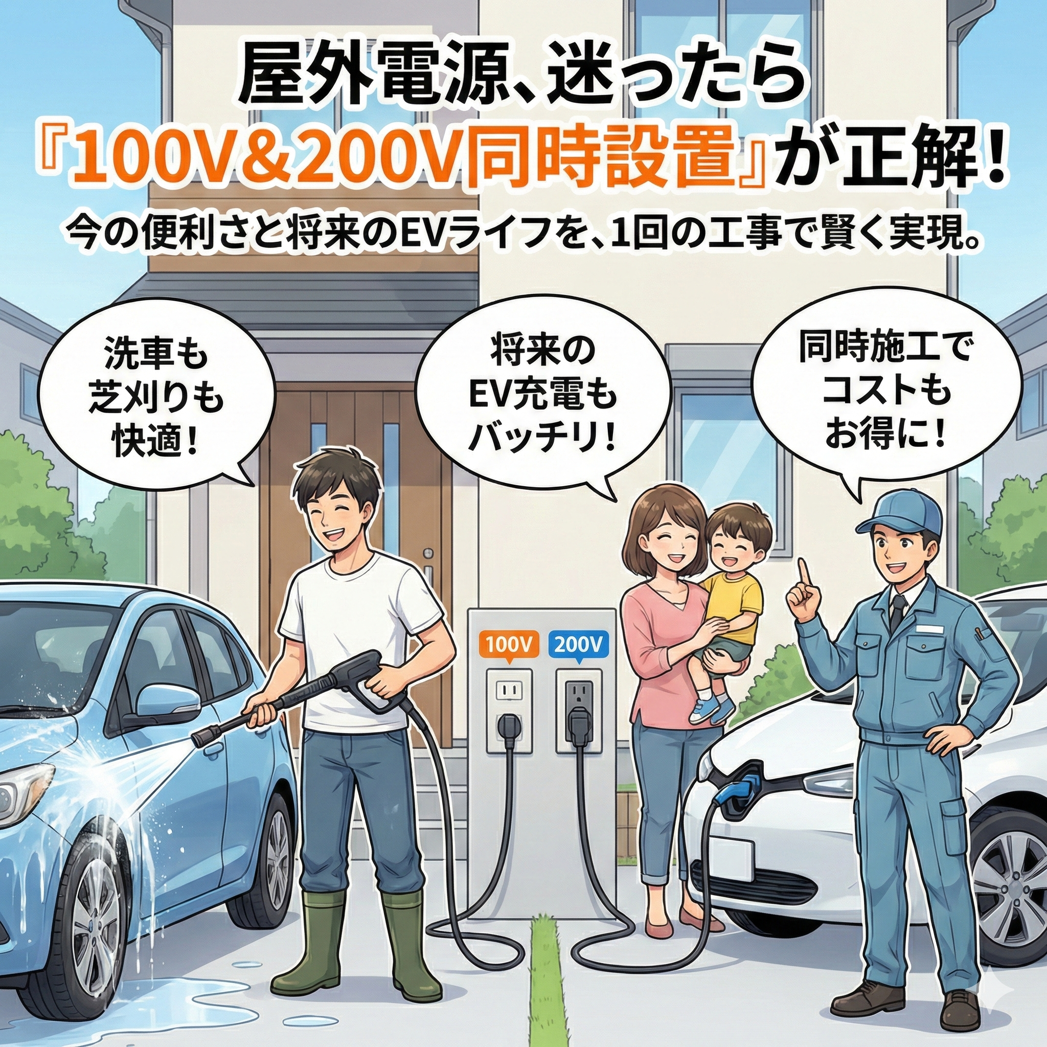 屋外コンセント増設工事屋外電源は100Vと200Vどっち?将来のEV充電も叶える「同時設置」のすすめ