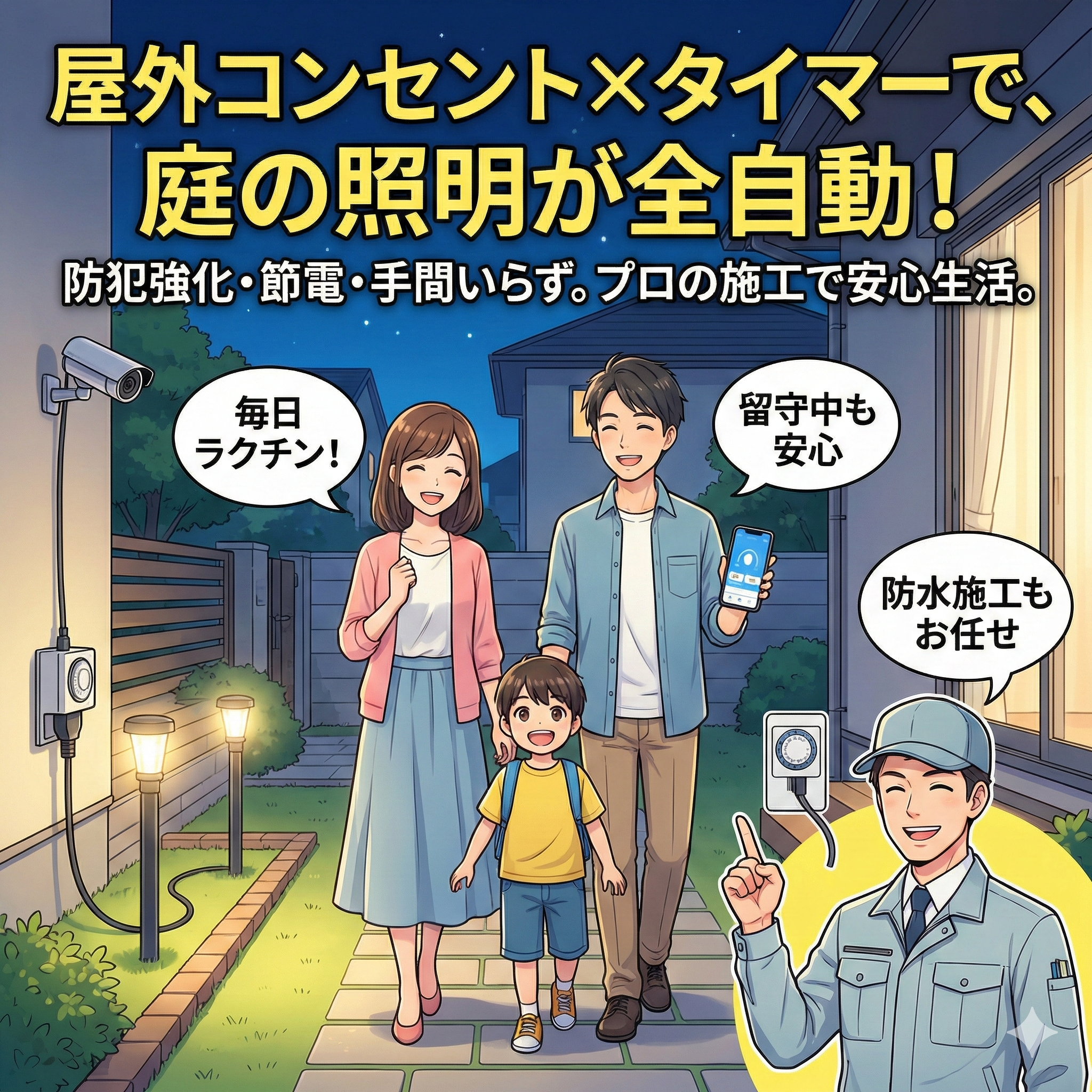 屋外コンセント増設工事屋外コンセント×タイマーで庭照明を自動化!防犯・節電・手間いらずの外構へ