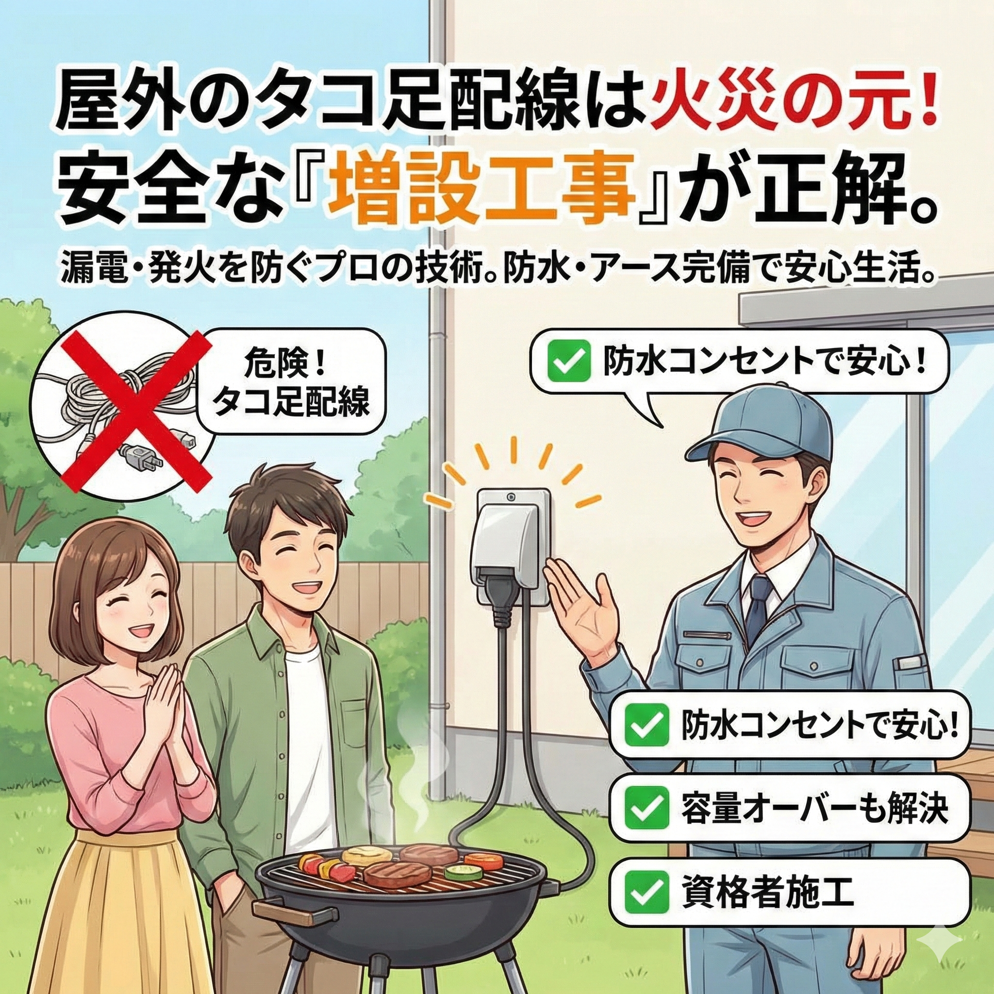 屋外コンセント増設工事屋外コンセントのタコ足配線はなぜNG?漏電・火災を防ぐ安全な分岐術