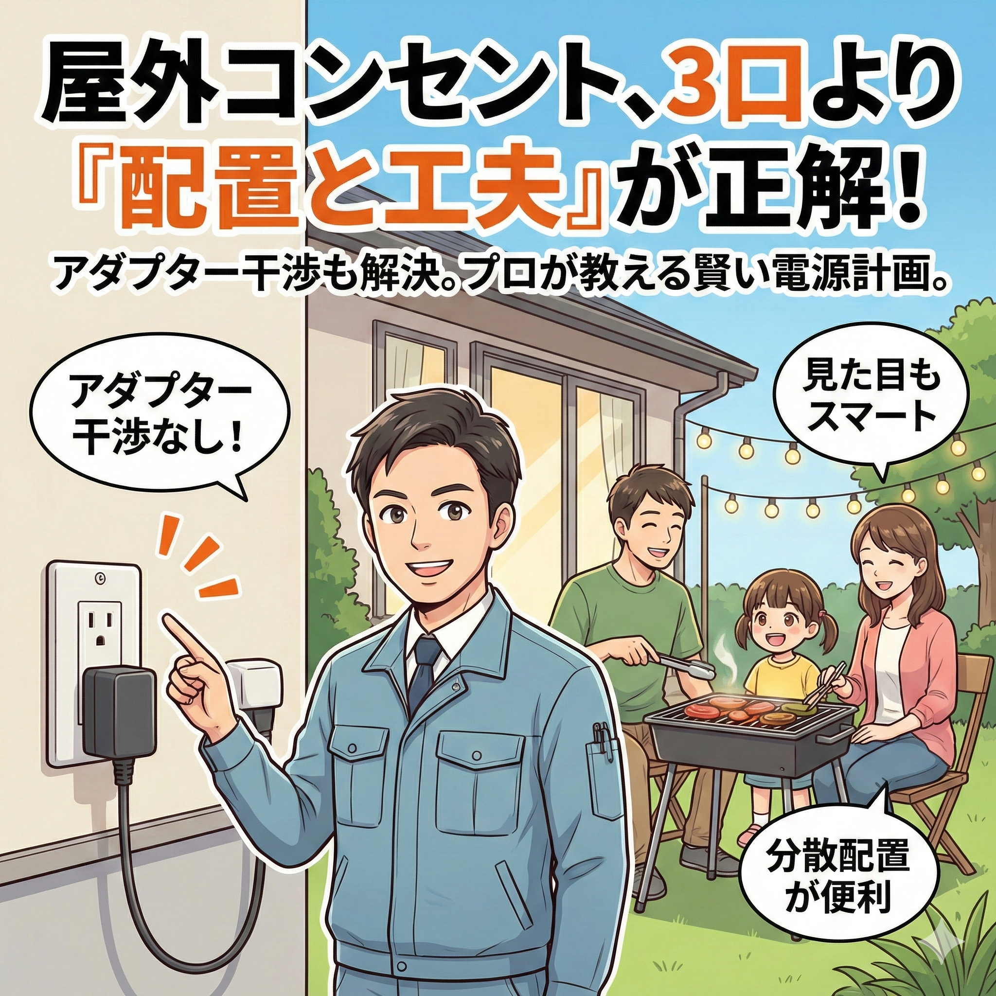 屋外コンセント増設工事屋外コンセントは3口必要?利便性と「アダプター干渉」の落とし穴を回避する完全ガイド