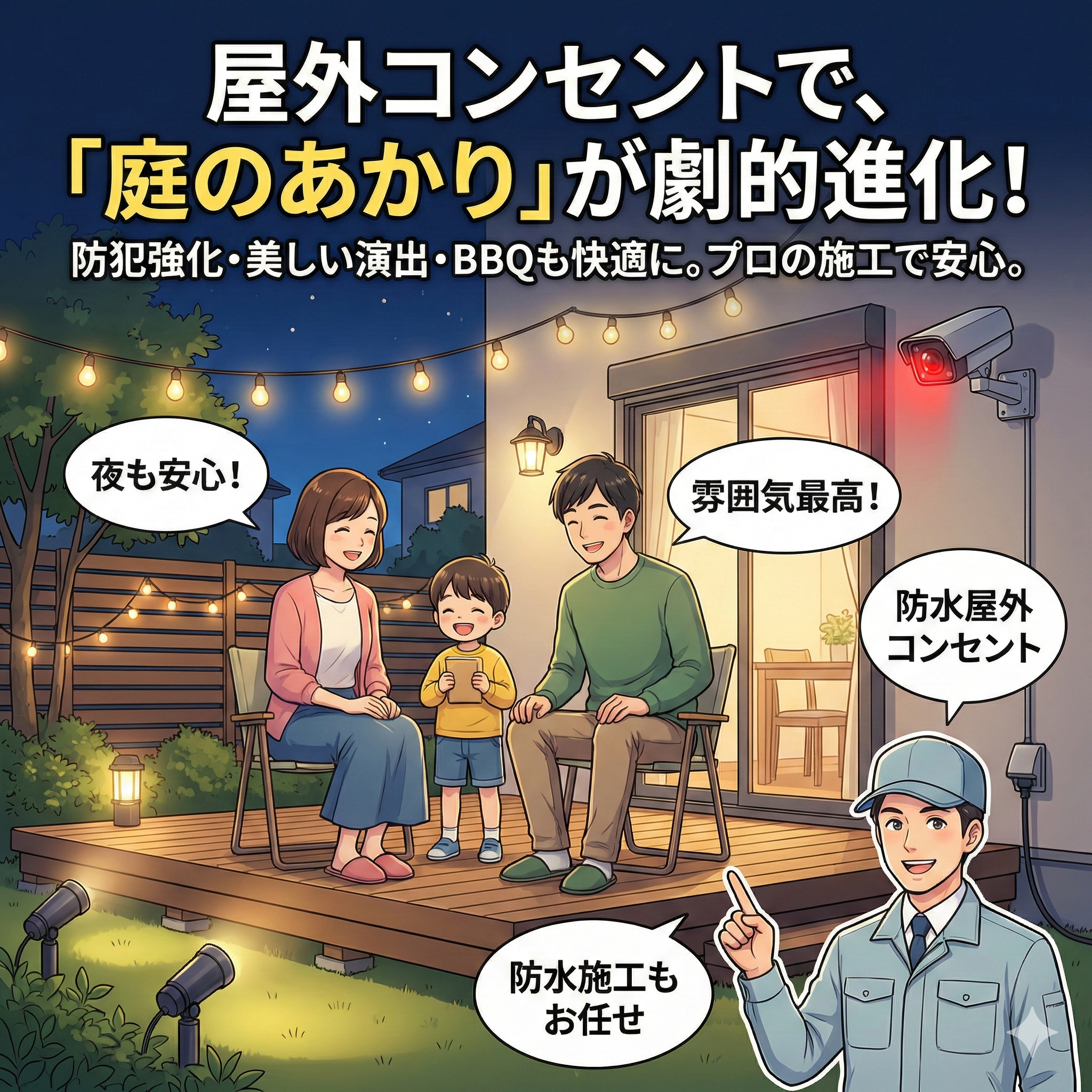 屋外コンセント増設工事屋外コンセントで叶える「庭のあかり」!防犯と演出を両立する照明プランと設置のコツ
