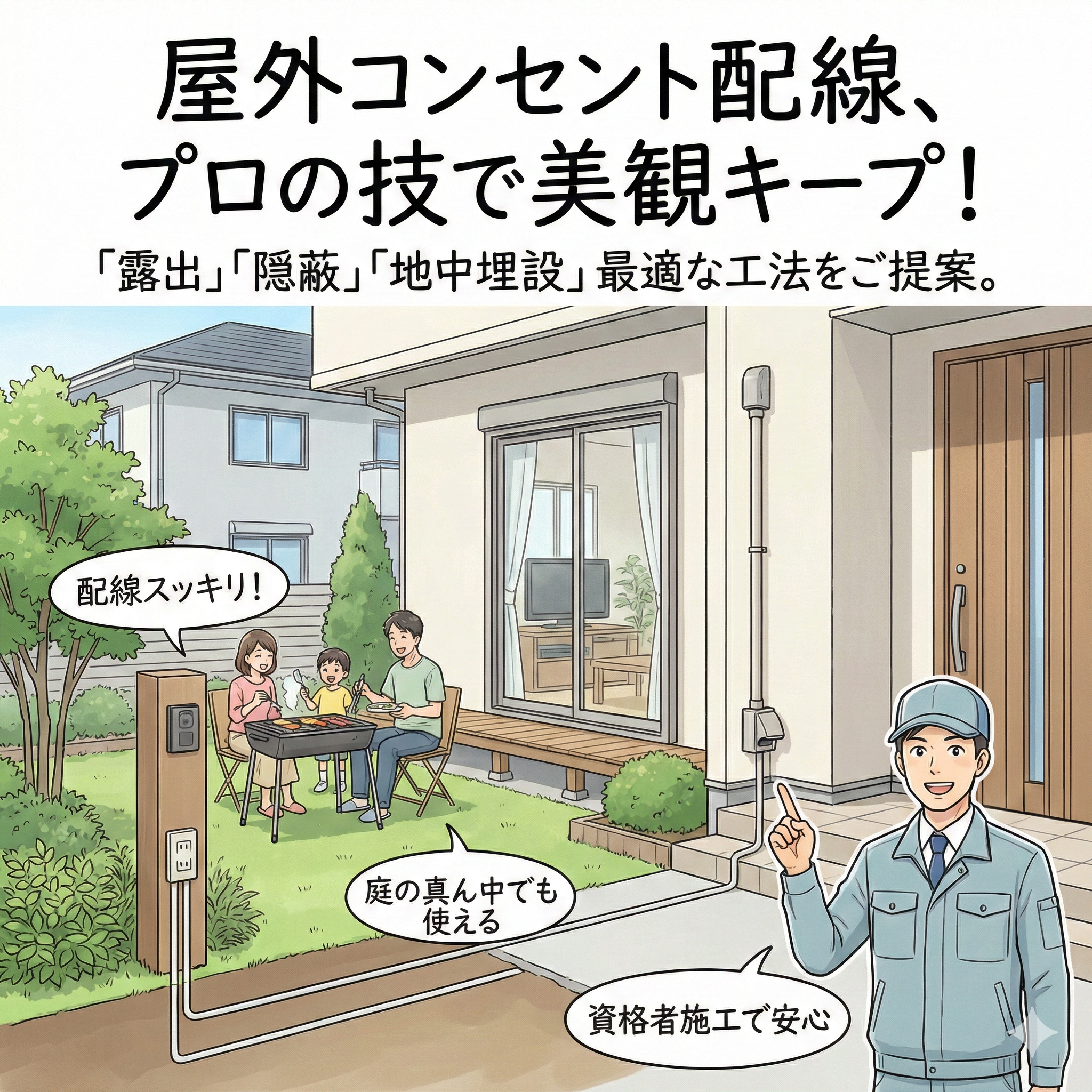 屋外コンセント増設工事屋外コンセントの配線ガイド|露出・隠蔽・地中埋設の違いと美観を守るプロの技