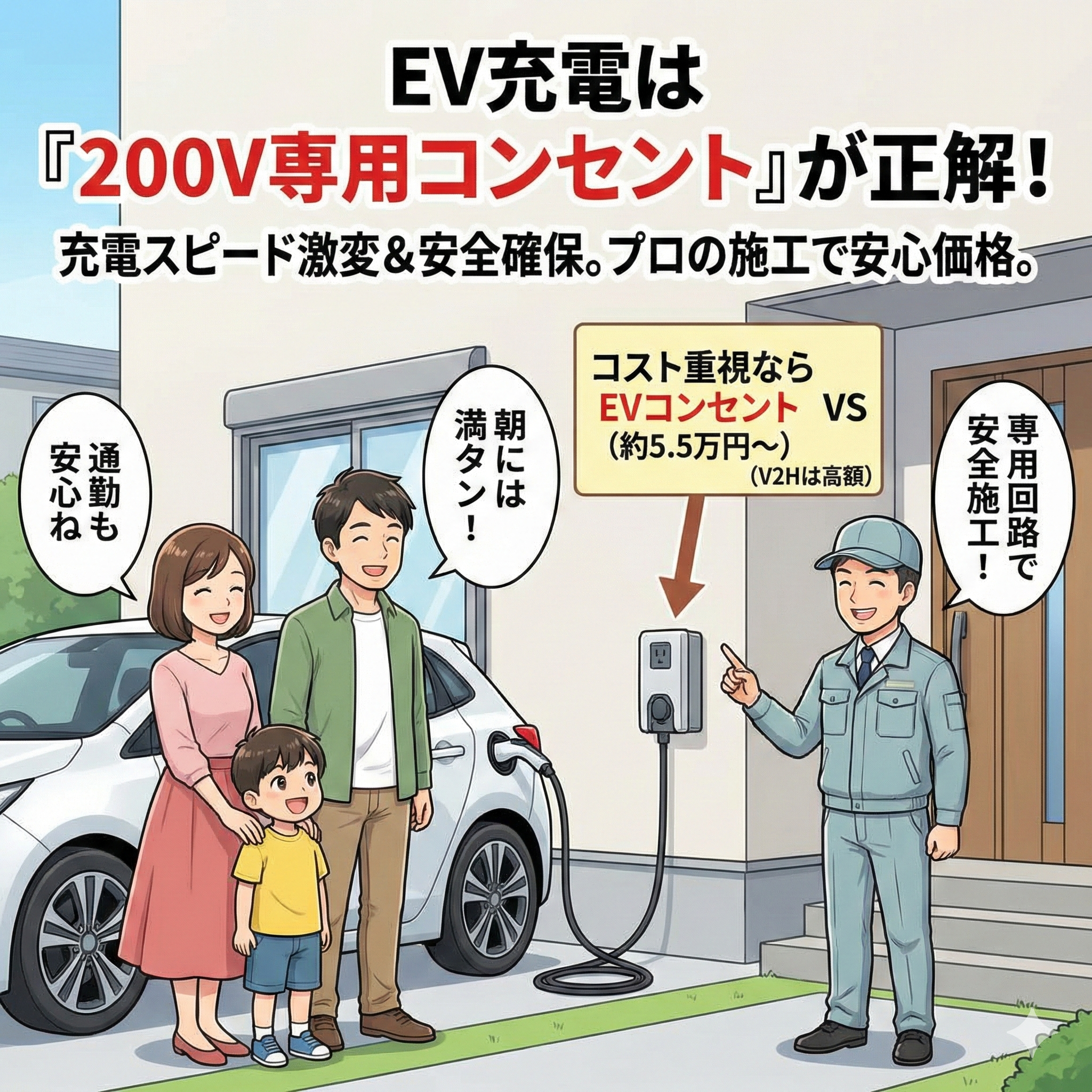 屋外コンセント増設工事EV時代に必須!屋外200Vコンセント設置の注意点と費用相場|V2Hとの違いも解説