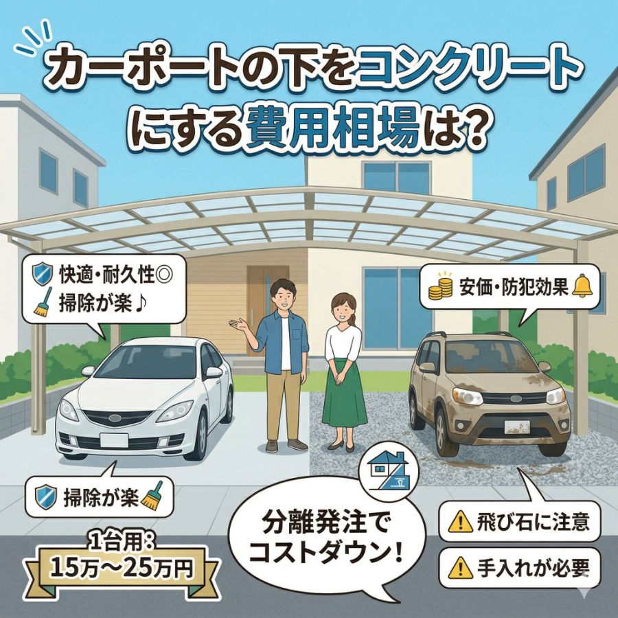カーポートカーポートの下をコンクリートにする費用相場は?砂利との比較や安く抑えるコツを解説