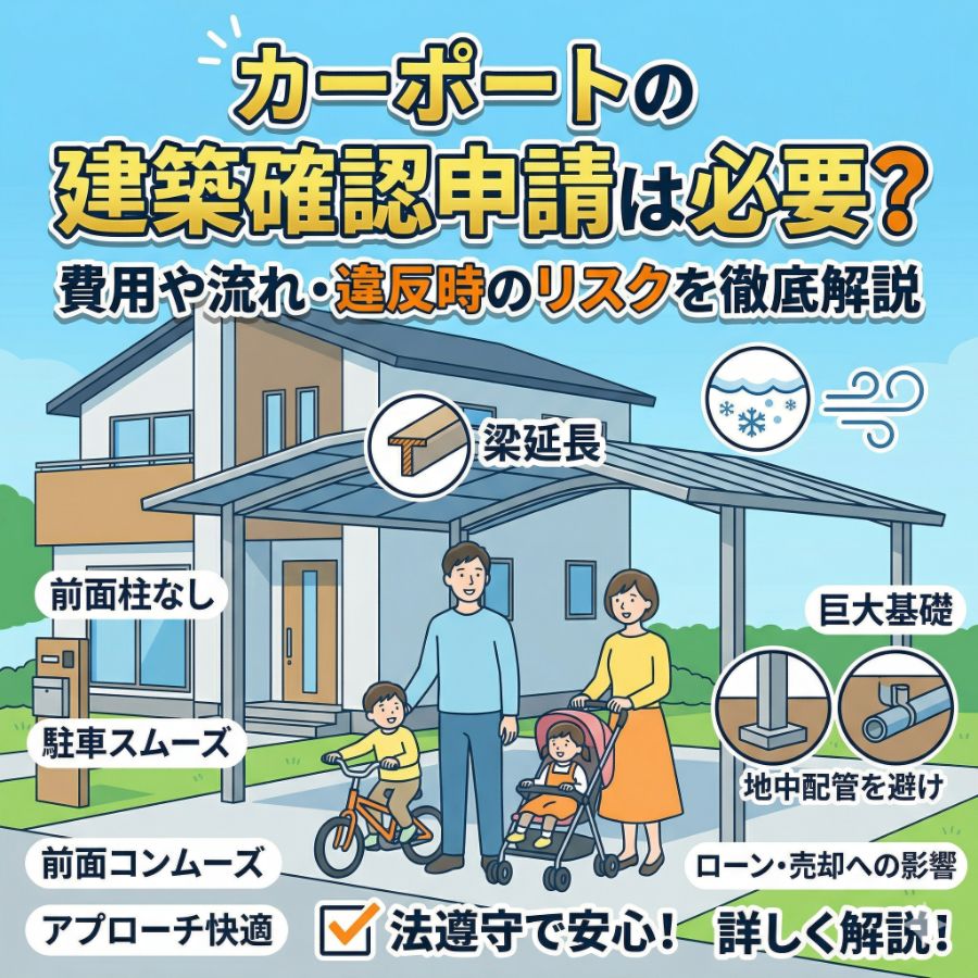カーポートを設置する際、原則として建築確認申請が必要になるケースが一般的です。お住まいの地域やカーポートのサイズによって条件は異なりますが、申請を怠ると将来的な売却やローン審査に影響が出るリスクがあります。本記事では、建 […]