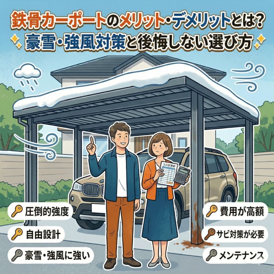 カーポート鉄骨カーポートのメリット・デメリットとは?豪雪・強風対策と後悔しない選び方