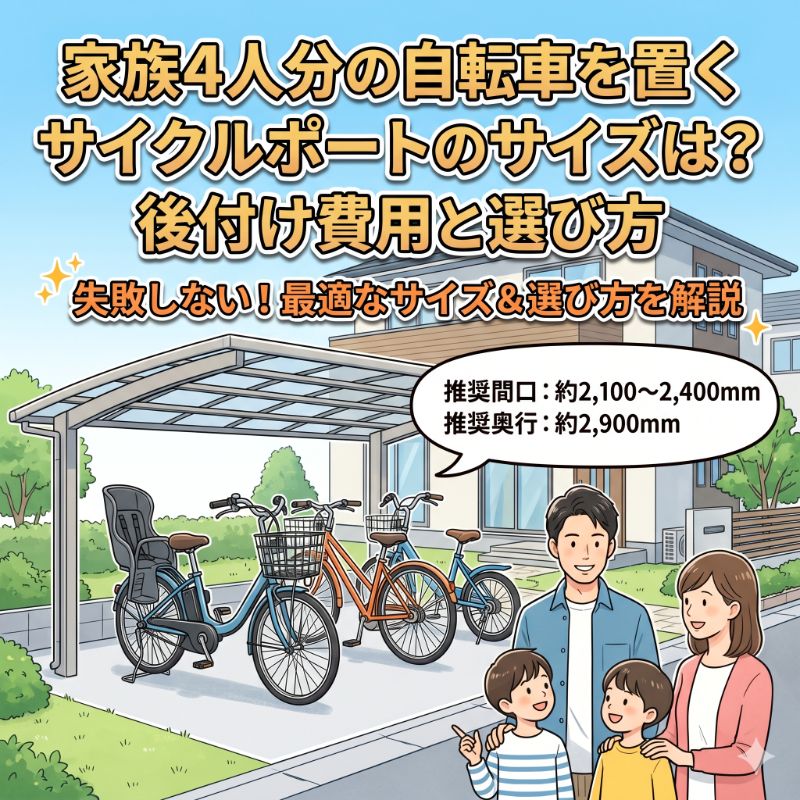サイクルポート家族4人分の自転車を置くサイクルポートのサイズは?後付け費用と選び方