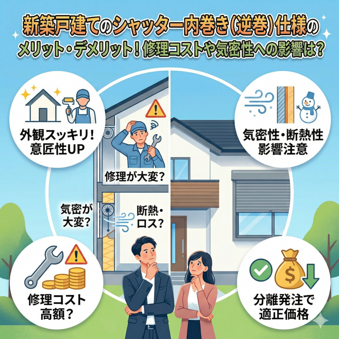 新築戸建ての外観デザインにこだわり、シャッターボックスを隠す「内巻き(ビルトイン)」仕様を検討されている方は少なくありません。確かに意匠性は高まりますが、将来のメンテナンスや修理コスト、気密性への影響など、実用面でのリス […]